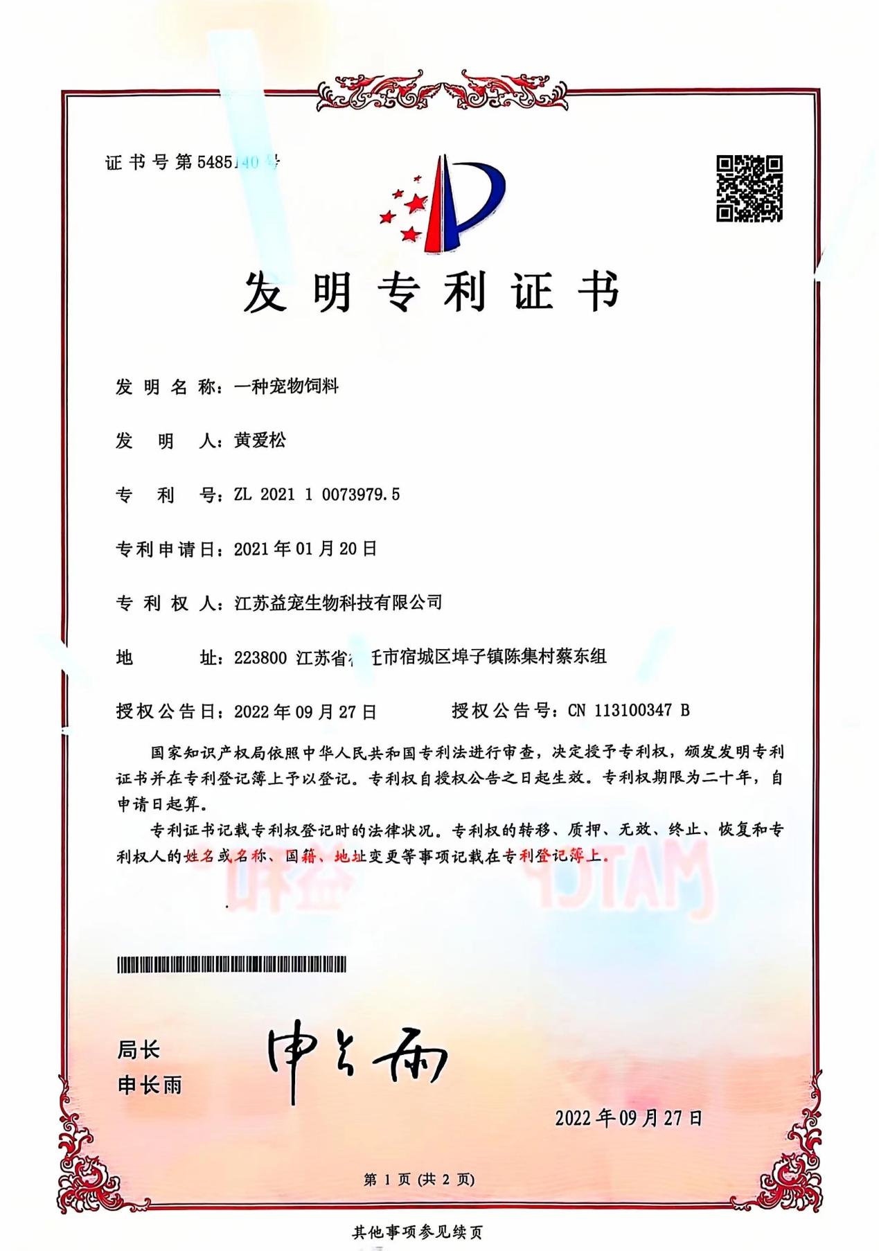 2016年8月江苏益宠生物科技有限公司成立,注册资金2400万元人民币,总投资近6000万元人民币,公司占地面积18000平方米,总建筑面积9800平方米,现有员工近300人,公司拥有单一 饲料和配合饲料生产许可证、食品安全认证体系 22000 资质证书,拥有 15 项宠物食品国家专利同时具备欧盟等出口认证。公司主营宠物食品生物科技开发应用,其中具备较高科技含量的宠物水解口味增强剂一举打开市场,建设了国内高标准的宠物湿粮生产线,具有日产20万罐宠物罐头生产能力。公司先后被评为国家科技型企业、省民营科技企业、省农业科技型企业、省高新技术企业、市农业龙头企业。